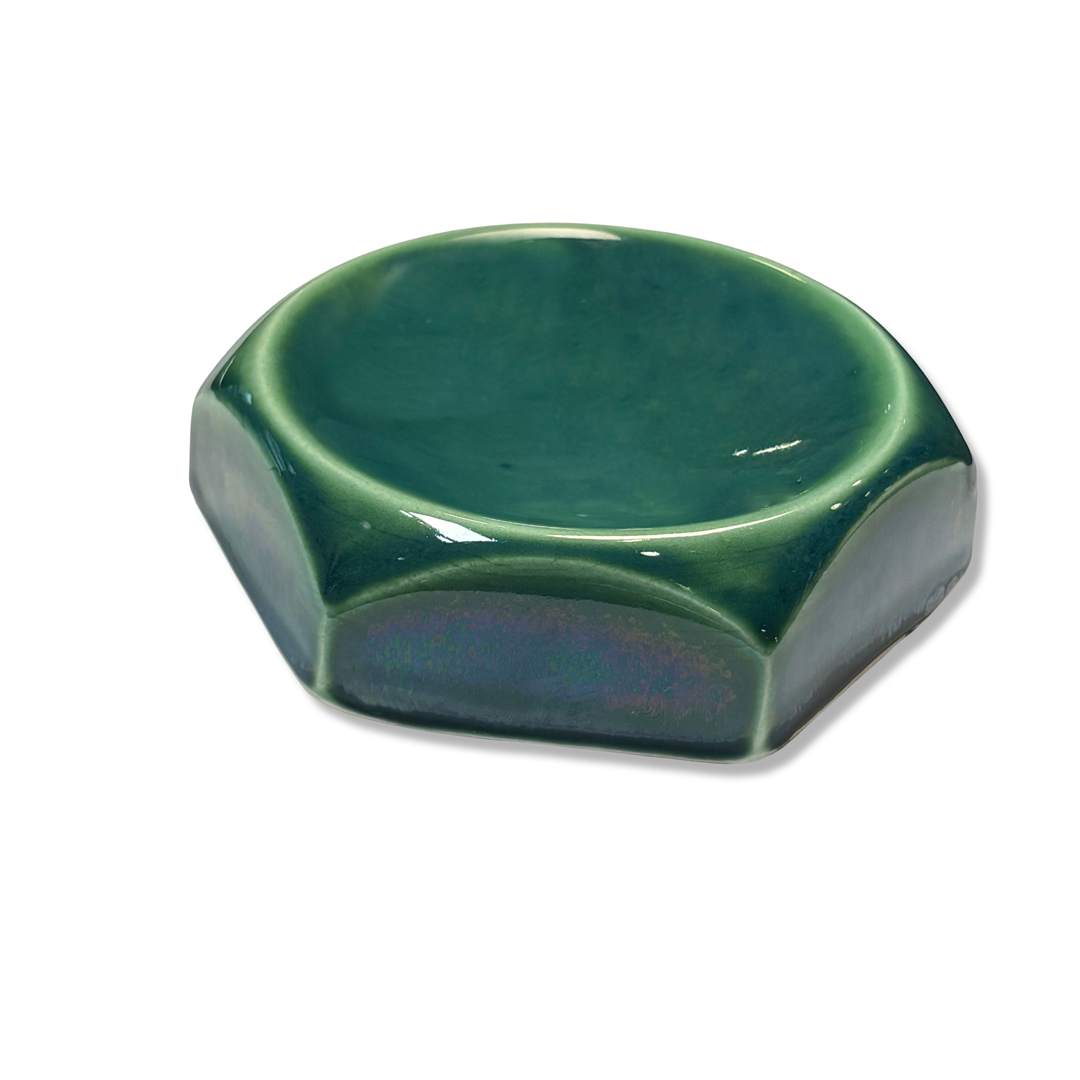 سرامیک دست ساز طرح رکا دارای طراحی خاصی است که ترکیبی از فرم هندسی و انحنای نرم در لبهها را به تصویر میکشد. سطح لعابخوردهی براق آن در رنگ سبز فیروزهای عمیق، حس آرامش و طبیعت را به فضا منتقل میکند. طراحی شش ضلعی آن، این محصول را از نظر بصری منحصربهفرد کرده است و باعث میشود در ترکیب با سایر عناصر دکوراتیو برجسته شود.